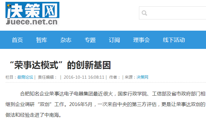 | 近日,新華社、亞太日報、經(jīng)濟日報的關(guān)注目光相繼投向榮事達,并對其做專(zhuān)題報道,報道中指出:榮事達電子電器集團將老品牌集聚的資金、制造、市場(chǎng)等九大要素,全部集中在智能家居雙創(chuàng )中心這一平臺上,以智能家居產(chǎn)業(yè)為新的戰略定位,對創(chuàng )客實(shí)行分階段精準扶持。原文報道如下:新華社《亞太日報》中國企業(yè)借助“互聯(lián)網(wǎng)+”構筑發(fā)展新優(yōu)勢在安徽省... |