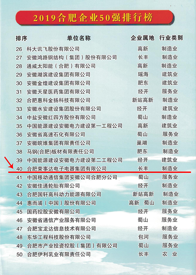合肥榮事達電子電器集團有限公司榮登2019合肥企業(yè)50強、2019合肥制造業(yè)企業(yè)30強榜單。