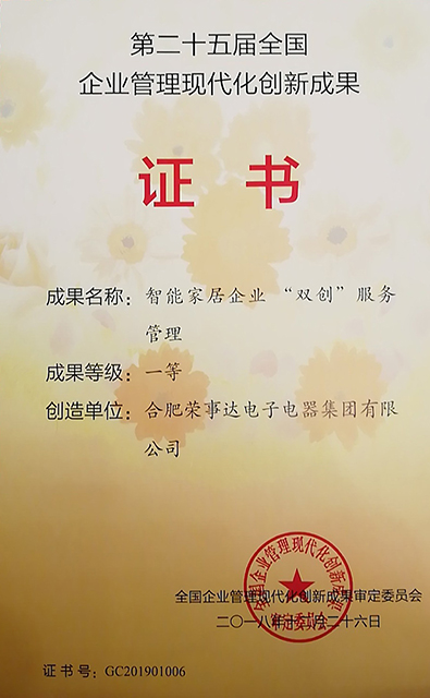 2018年12月,合肥榮事達電子電器集團有限公司《智能家居企業(yè)“雙創(chuàng )”服務(wù)管理成果》榮獲第二十五屆全國企業(yè)管理現代化創(chuàng )新成果一等獎,與中國航空工業(yè)集團有限公司、國家電網(wǎng)有限公司、中國運載火箭技術(shù)研究院、中國路橋工程有限責任公司等單位并列入選。