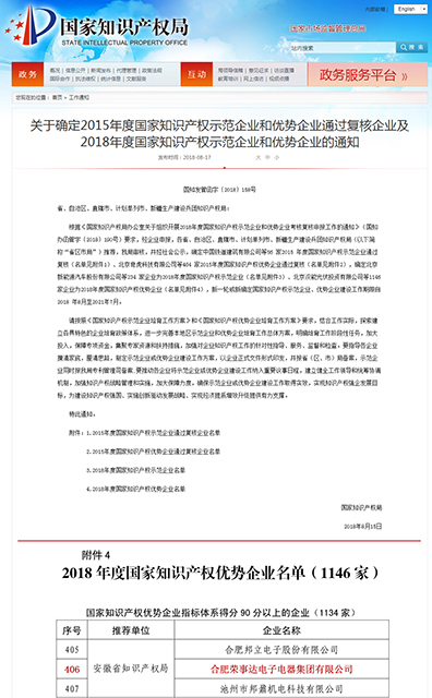 2018年8月,國家知識產(chǎn)權局發(fā)布《關(guān)于確定2015年度國家知識產(chǎn)權示范企業(yè)和優(yōu)勢企業(yè)通過(guò)復核企業(yè)及2018年度國家知識產(chǎn)權示范企業(yè)和優(yōu)勢企業(yè)》通知。榮事達電子電器集團榮獲“國家知識產(chǎn)權優(yōu)勢企業(yè)”稱(chēng)號,這是國家知識產(chǎn)權局對榮事達知識產(chǎn)權管理水平的肯定。