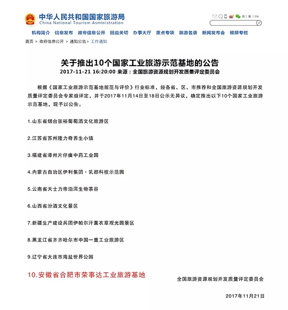 2017年11月,國家旅游局發(fā)布《關(guān)于推出10個(gè)國家工業(yè)旅游示范基地的公告》,公布了經(jīng)全國旅游資源規劃開(kāi)發(fā)質(zhì)量評定委員會(huì )專(zhuān)家組嚴格評定后,確定推出的10個(gè)國家工業(yè)旅游示范基地。
