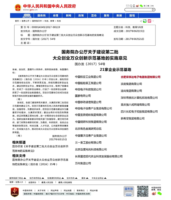 2017年6月,合肥榮事達電子電器集團有限公司成功躋身國務(wù)院頒發(fā)的“大眾創(chuàng )業(yè)萬(wàn)眾創(chuàng )新示范基地”名單。
