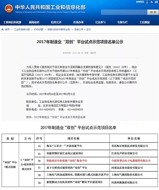 2017年10月,合肥榮事達電子電器集團有限公司“智能家居全價(jià)值鏈‘雙創(chuàng )’服務(wù)平臺”被工信部評定為制造業(yè)“雙創(chuàng )”平臺試點(diǎn)示范項目。