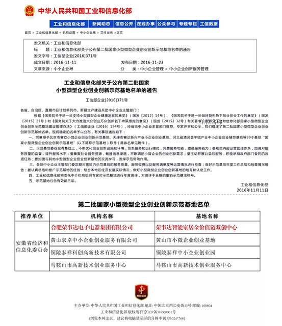 2016年11月,合肥榮事達電子電器集團有限公司入選工信部“國家小型微型企業(yè)創(chuàng )業(yè)創(chuàng )新示范基地”。
