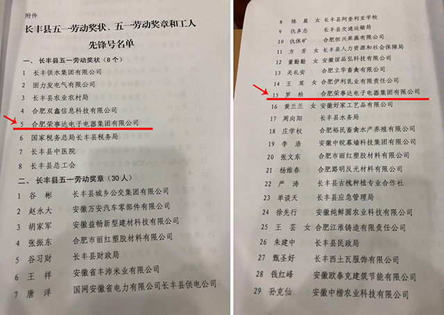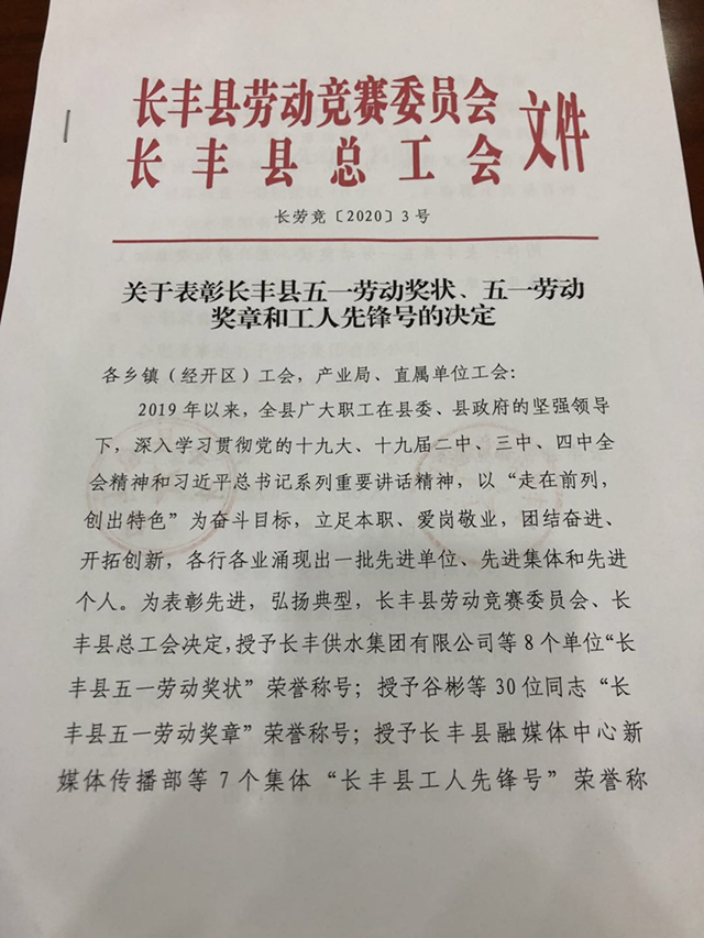 榮獲“長(cháng)豐縣五一勞動(dòng)獎狀”;