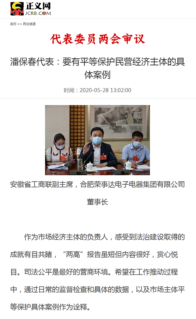 5月28日,中華人民共和國最高人民檢察院主管、檢察日報社主辦的官方網(wǎng)站——正義網(wǎng),刊登了全國人大代表、合肥榮事達電子電器集團有限公司董事長(cháng)潘保春的相關(guān)觀(guān)點(diǎn)。