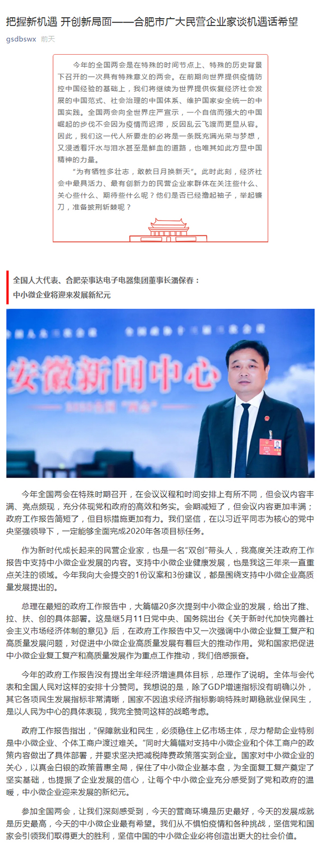 5月27日,《工商導報》官方微信公眾號報道了全國人大代表、合肥榮事達電子電器集團有限公司董事長(cháng)潘保春對中小微企業(yè)發(fā)展的看法。