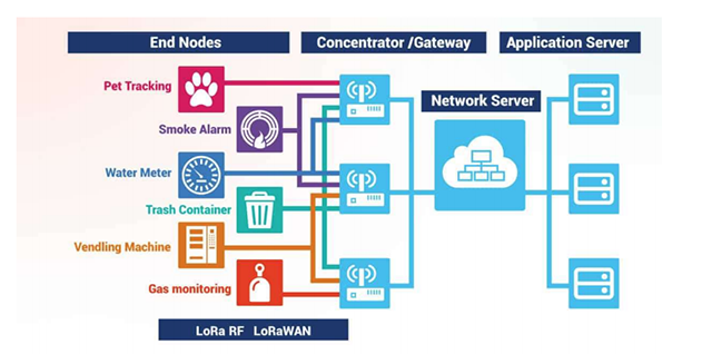 LoRa(Long-Range)技術(shù)適用于所有需要小數據包遠程傳輸的應用,在城市環(huán)境中可以估計到5到10公里的距離,在農村地區可以估計到30公里的距離。LoRa協(xié)議包括不同的應用領(lǐng)域:智能農業(yè)、智能建筑(失水檢測、結構健康監測)和智能房屋管理(恒溫器、灑水器、門(mén)鎖)。LoRa使用源自CSS(線(xiàn)性擴頻)調制的擴展頻譜調制。所使用的無(wú)線(xiàn)電頻段低于1GHz,在歐洲為433MHz和868MHz。