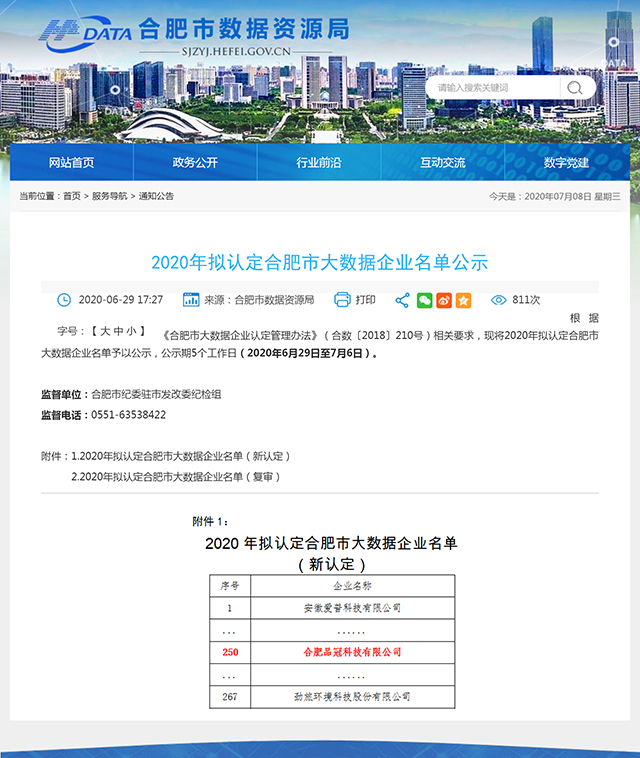 近日,合肥市數據資源局公示了《2020年擬合肥市大數據企業(yè)名單》,合肥榮事達電子電器集團有限公司旗下創(chuàng )客單位——合肥品冠科技有限公司順利通過(guò)評審,榮登榜單。