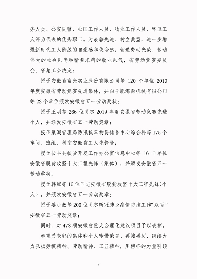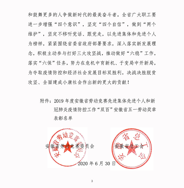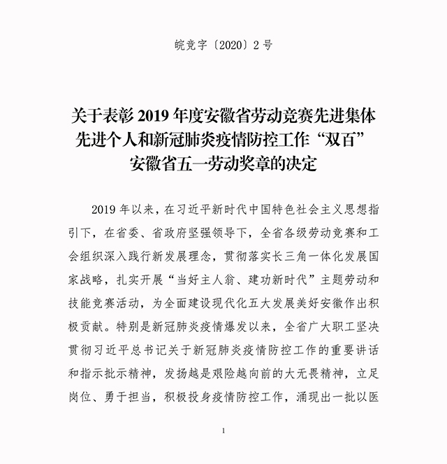 近日,安徽省總工會(huì )印發(fā)《關(guān)于表彰2019年度安徽省勞動(dòng)競賽先進(jìn)集體先進(jìn)個(gè)人和新冠肺炎疫情防控工作“雙百”安徽省五一勞動(dòng)獎?wù)碌臎Q定》,表彰一批先進(jìn)集體先進(jìn)個(gè)人。