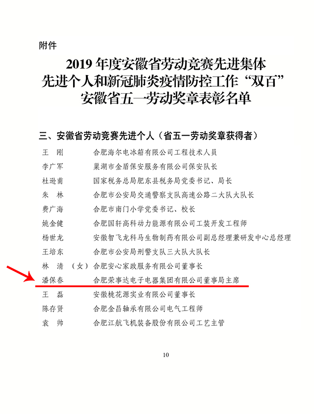 合肥榮事達電子電器集團有限公司董事長(cháng)潘保春獲評2019年度安徽省勞動(dòng)競賽先進(jìn)個(gè)人,并獲得安徽省五一勞動(dòng)獎?wù)隆?/strong>