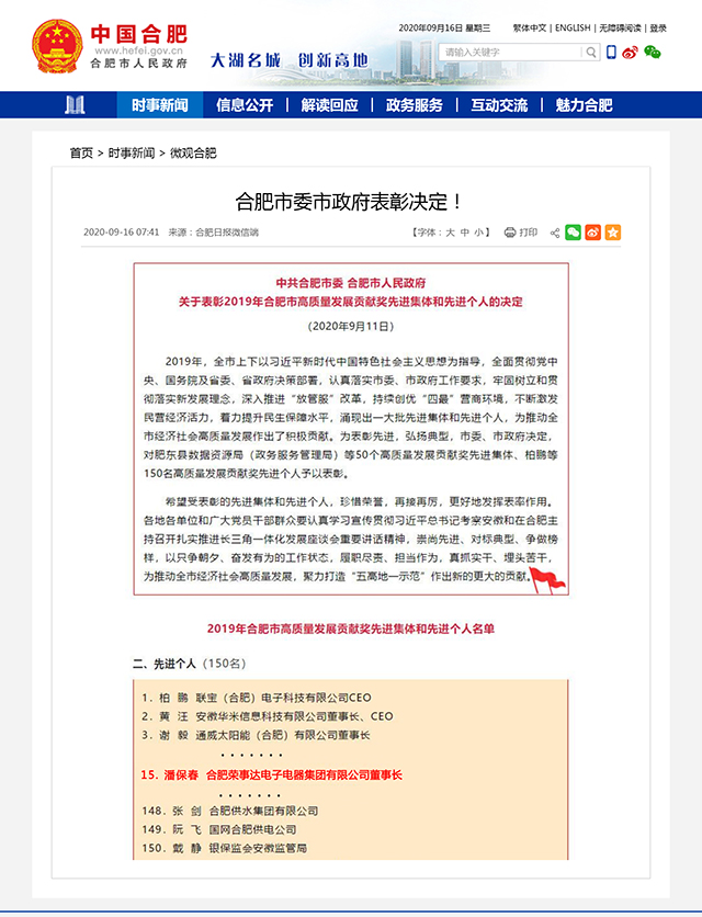 近日,中共合肥市委、合肥市人民政府公布《關(guān)于表彰2019年合肥市高質(zhì)量發(fā)展貢獻獎先進(jìn)集體和先進(jìn)個(gè)人的決定》,授予50個(gè)集體和150名先進(jìn)個(gè)人高質(zhì)量發(fā)展貢獻獎。合肥榮事達電子電器集團有限公司董事長(cháng)潘保春獲“高質(zhì)量發(fā)展貢獻獎”先進(jìn)個(gè)人。