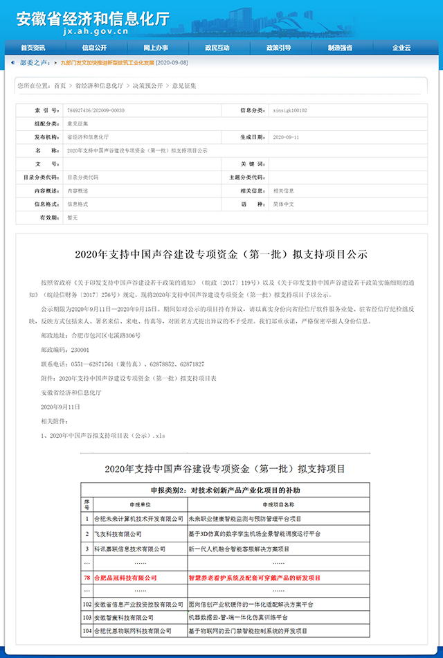 近日,2020年支持中國聲谷建設專(zhuān)項資金(第一批)支持項目名單公示。合肥榮事達電子電器集團有限公司旗下創(chuàng )客單位合肥品冠科技有限公司的“智慧養老看護系統及配套可穿戴產(chǎn)品的研發(fā)項目”,入選安徽省2020年支持中國聲谷建設技術(shù)創(chuàng )新產(chǎn)品產(chǎn)業(yè)化專(zhuān)項資金支持項目。