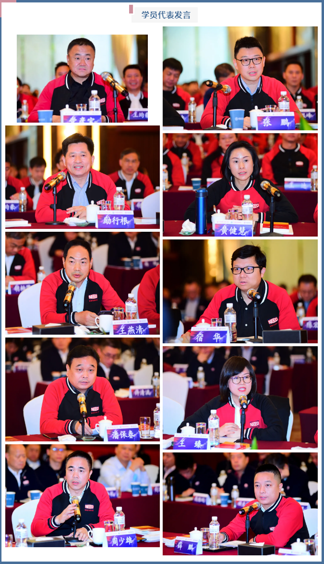 座談會(huì )上,寧夏寶豐集團董事長(cháng)黨彥寶、北京微星優(yōu)財網(wǎng)絡(luò )科技有限公司CEO張鵬、寧波天生密封件有限公司董事長(cháng)勵行根、星河灣集團總裁黃健慧、無(wú)錫先導智能裝備股份有限公司董事長(cháng)王燕清、北京快手科技有限公司CEO宿華、合肥榮事達電子電器集團有限公司董事長(cháng)潘保春、內蒙古鄂爾多斯資源股份有限公司董事長(cháng)王臻、福建七匹狼實(shí)業(yè)股份有限公司董事長(cháng)周少雄、北京閃送科技有限公司CEO薛鵬等十余位學(xué)員代表先后發(fā)言,回顧了一年來(lái)的學(xué)習歷程和收獲,表示在學(xué)習中提升了個(gè)人素養、升華了彼此友誼、培養了良好的學(xué)習習慣,NEED班級已經(jīng)成為民營(yíng)企業(yè)家自由交流的平臺和思想激蕩的舞臺,給了大家強烈的方向感、歸屬感。