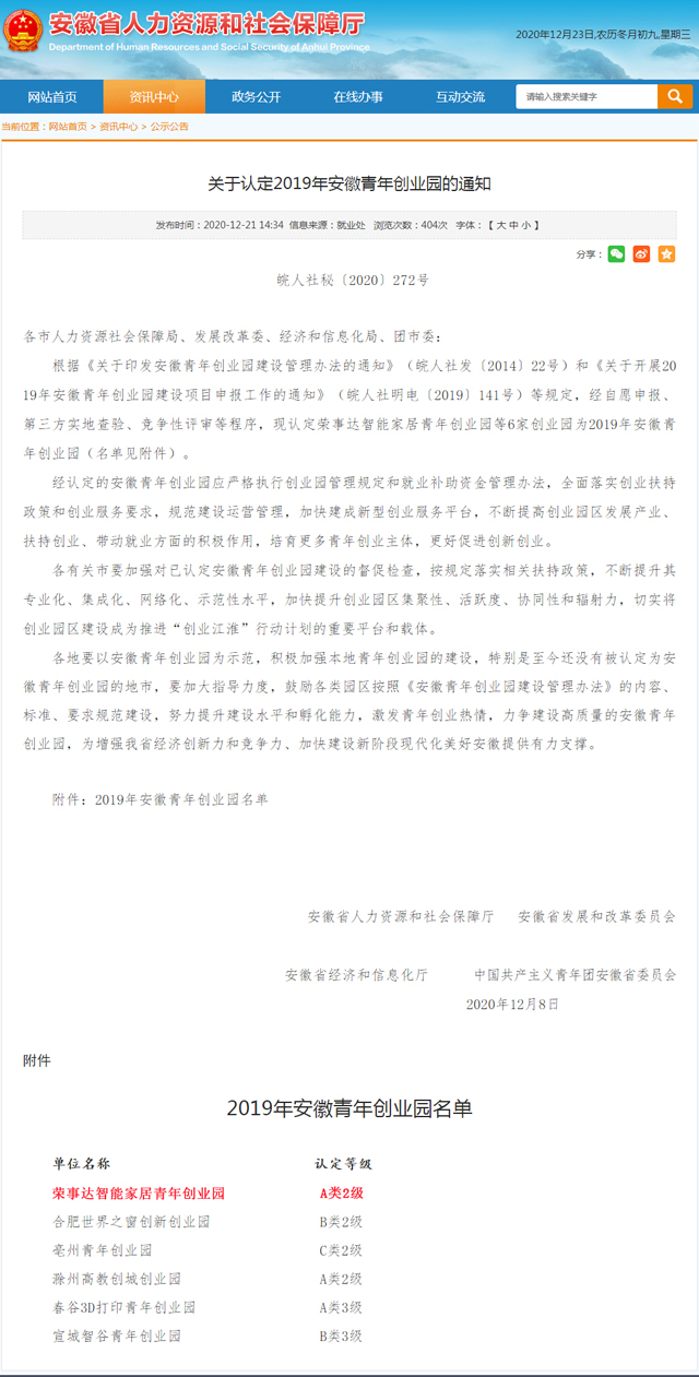 近日,安徽省人力資源和社會(huì )保障廳發(fā)布了《關(guān)于認定2019年安徽青年創(chuàng )業(yè)園的通知》。由合肥榮事達電子電器集團有限公司建設運營(yíng)的榮事達智能家居青年創(chuàng )業(yè)園獲評省級青年創(chuàng )業(yè)園資質(zhì),被認定為A類(lèi)2級安徽省青年創(chuàng )業(yè)園。