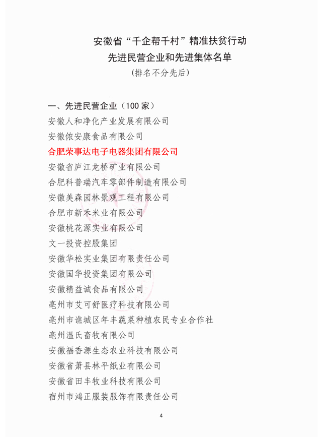 日前,安徽省“千企幫千村”精準扶貧行動(dòng)先進(jìn)民營(yíng)企業(yè)和先進(jìn)集體名單公布,合肥榮事達電子電器集團有限公司榮獲省“千企幫千村”精準扶貧行動(dòng)“先進(jìn)民營(yíng)企業(yè)”表彰。