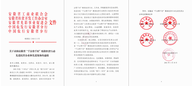 2016年,按照全國“萬(wàn)企幫萬(wàn)村”精準扶貧行動(dòng)領(lǐng)導小組的統一部署,安徽省工商業(yè)聯(lián)合會(huì )牽頭,聯(lián)合安徽省扶貧開(kāi)發(fā)工作辦公室、安徽省光彩事業(yè)促進(jìn)會(huì )、中國農發(fā)行安徽省分行、中國農行安徽省分行共同啟動(dòng)“千企幫千村”精準扶貧行動(dòng)。幾年來(lái),廣大民營(yíng)企業(yè)積極投身脫貧攻堅,在產(chǎn)業(yè)幫扶、就業(yè)幫扶、公益捐贈、技能培訓、抗疫防疫等方面積極作為,極大地改善了幫扶村生產(chǎn)生活條件,為打贏(yíng)脫貧攻堅戰做了大量卓有成效的工作。