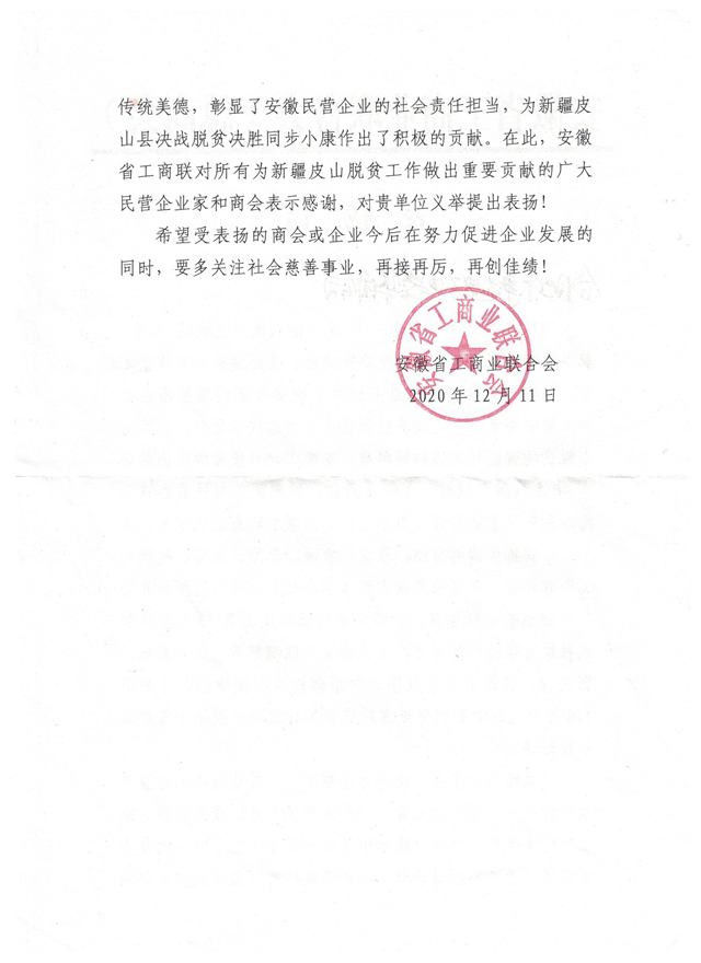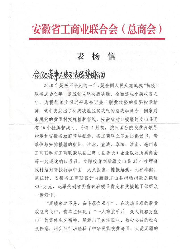 “在這場(chǎng)艱難的脫貧攻堅戰役中,貴單位體現了‘一人難挑千斤,眾人難移萬(wàn)座山’的集體主義精神,展示出了關(guān)注民生、熱心公益的社會(huì )責任感,用實(shí)際行動(dòng)詮釋了中華民族扶貧濟困、大愛(ài)無(wú)疆的傳統美德,彰顯了安徽民營(yíng)企業(yè)的社會(huì )責任擔當,為新疆皮山縣決戰脫貧決勝同步小康作出了積極的貢獻......”近日,合肥榮事達電子電器集團有限公司收到了一封滿(mǎn)載贊譽(yù)的表?yè)P信。