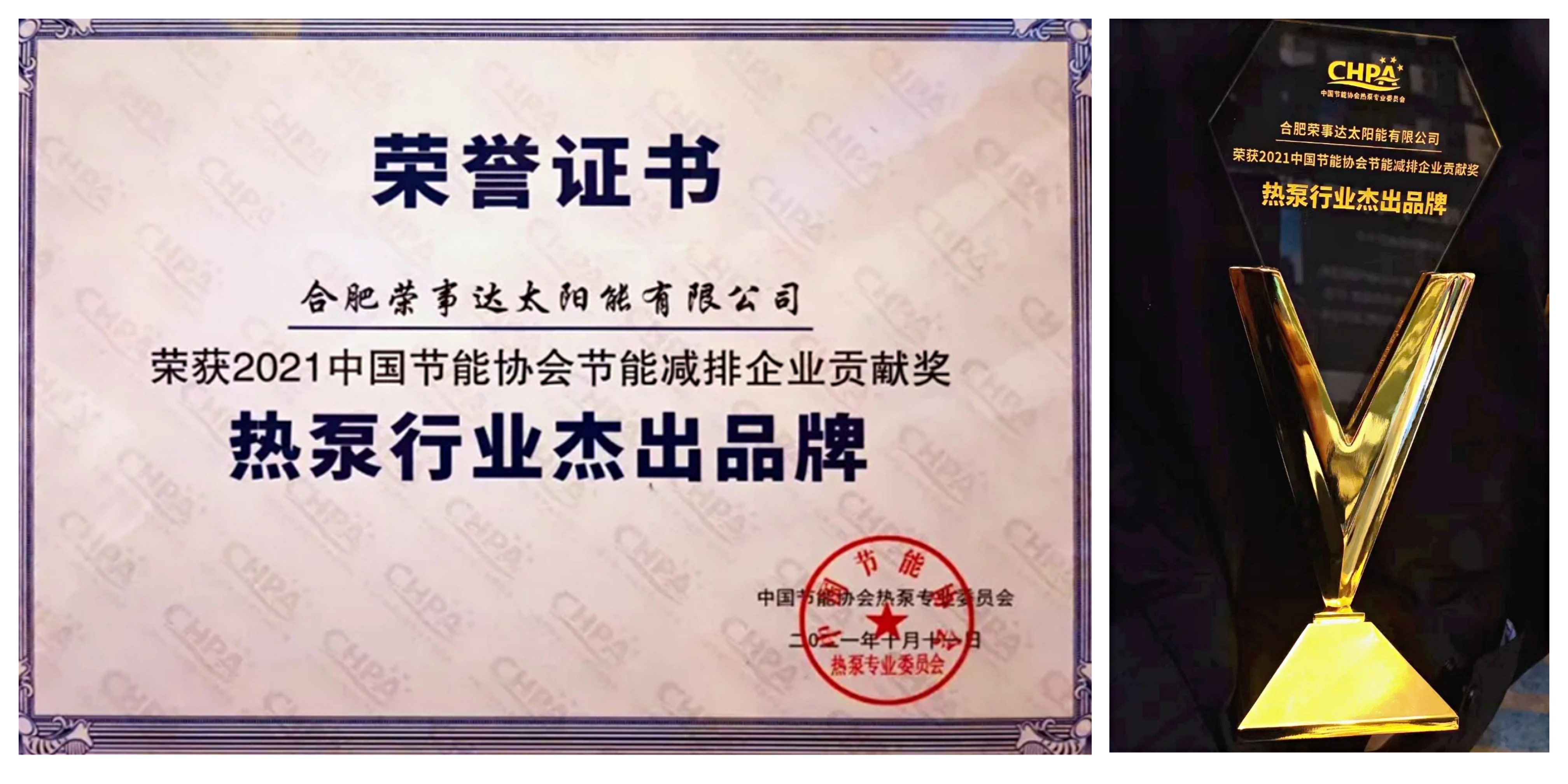 1012日,由中國節能協(xié)會(huì )主辦、中國節能協(xié)會(huì )熱泵專(zhuān)委會(huì )承辦的,2021中國熱泵行業(yè)年會(huì )在武漢勝利閉幕,榮事達集團再傳捷報:國家雙創(chuàng )示范基地項目單位——榮事達太陽(yáng)能有限公司榮獲“2021年度中國熱泵行業(yè)杰出品牌”。