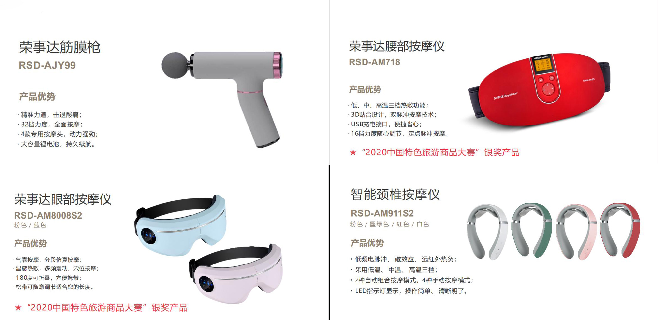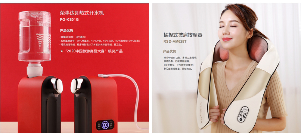 展會(huì )現場(chǎng),榮事達為觀(guān)眾們帶來(lái)了眾多集品質(zhì)與顏值于一體的文化+科技類(lèi)智能產(chǎn)品,包括:榮事達戶(hù)外旅行杯壺系列-即熱式開(kāi)水機、榮事達戶(hù)外旅行健康系列-筋膜槍、智能頸椎按摩儀、折疊款眼部按摩儀、揉捏式按摩披肩、智能腰部按摩儀等,將智慧科技融入健康生活,完美展現了榮事達在創(chuàng )新健康產(chǎn)品研發(fā)方面的最新成果。