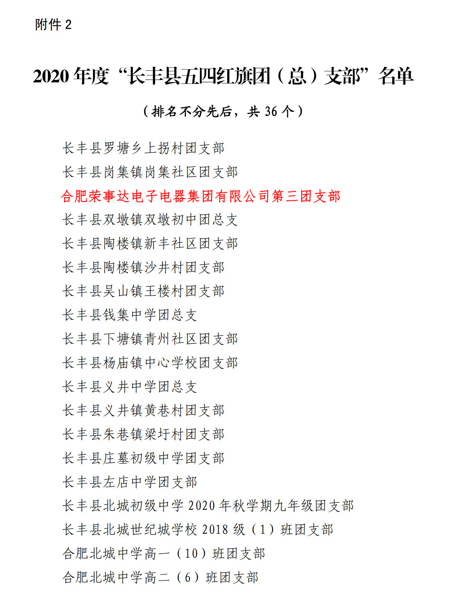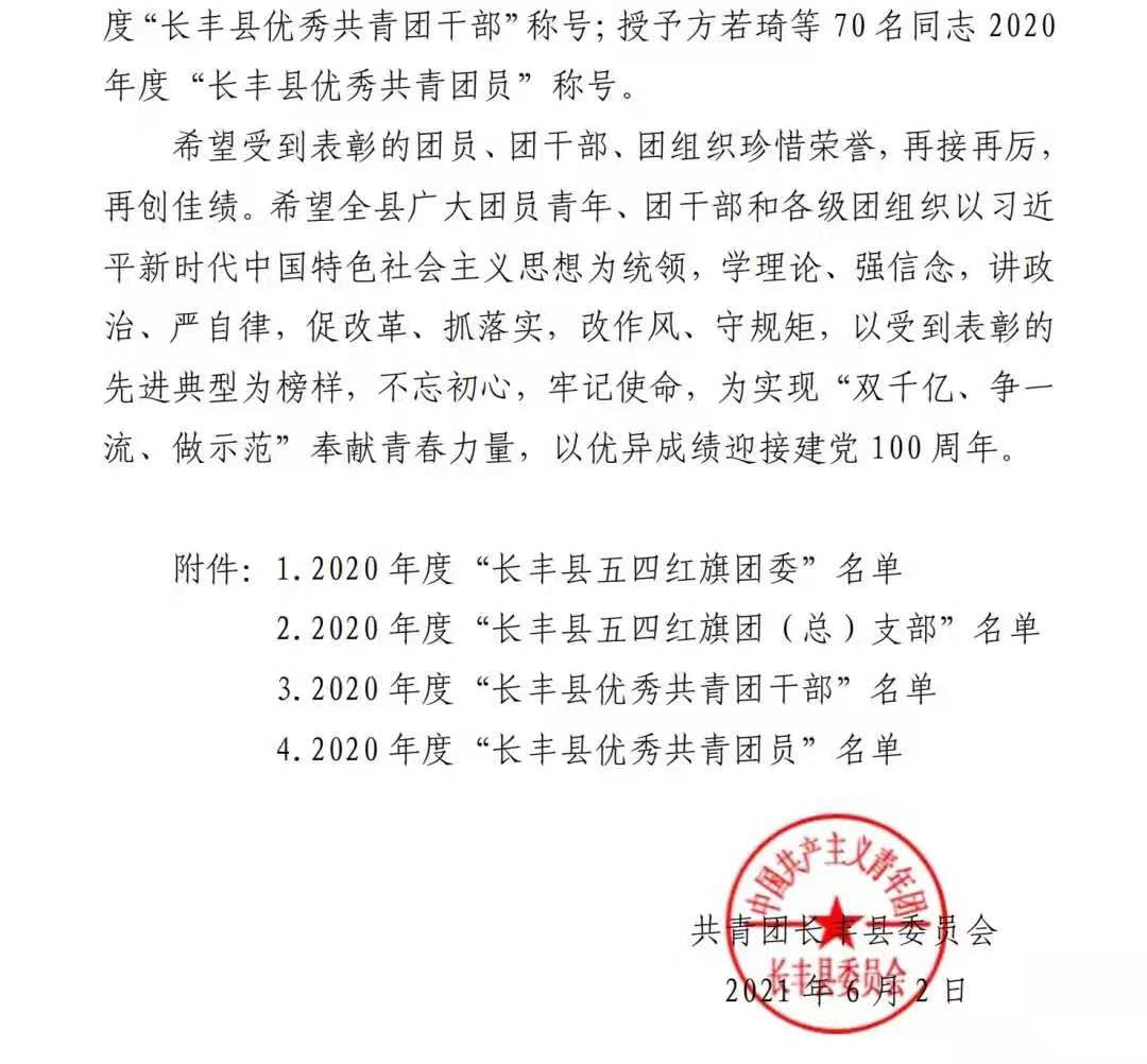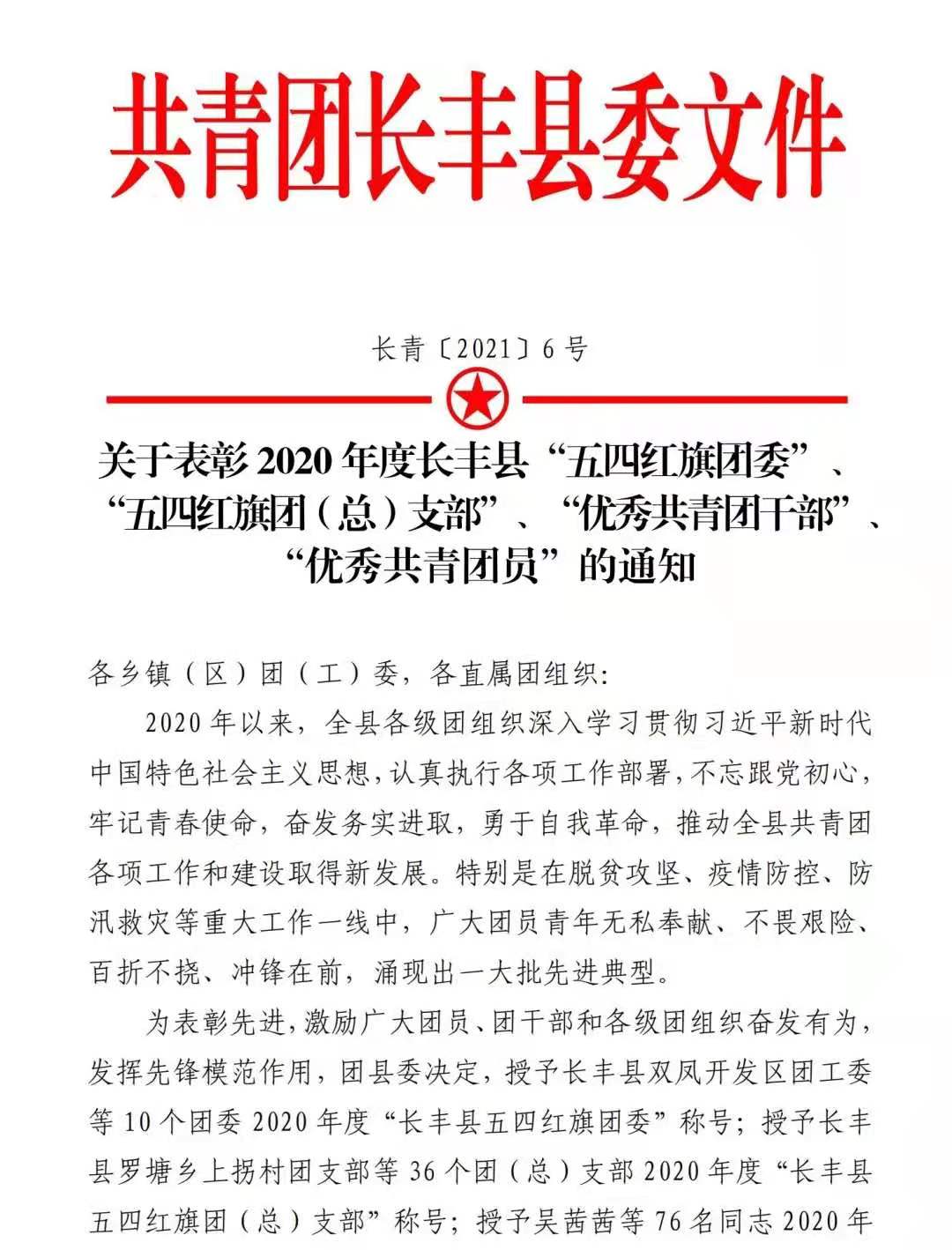 近日,共青團長(cháng)豐縣委發(fā)布《關(guān)于表彰 2020 年度長(cháng)豐縣“五四紅旗團委”、 “五四紅旗團(總)支部”、“優(yōu)秀共青團干部”、 “優(yōu)秀共青團員”的通知》,榮事達集團第三團支部被授予“長(cháng)豐縣五四紅旗團(總)支部”榮譽(yù)稱(chēng)號。