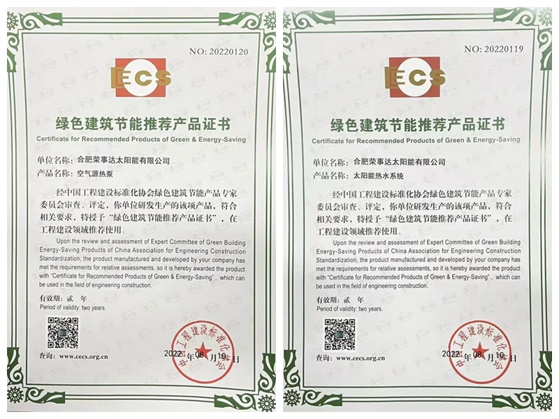 日前,經(jīng)中國工程建設標準化協(xié)會(huì )綠色建筑節能產(chǎn)品專(zhuān)家委員會(huì )嚴格審查、評定,榮事達集團旗下項目單位——合肥榮事達太陽(yáng)能有限公司自主研發(fā)生產(chǎn)的空氣源熱泵產(chǎn)品和太陽(yáng)能熱水系統,憑借過(guò)硬的產(chǎn)品質(zhì)量及技術(shù)服務(wù),榮獲“綠色建筑節能推薦產(chǎn)品”證書(shū)。