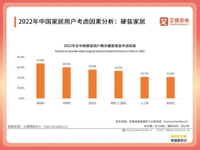 數據顯示,67.8%的家居用戶(hù)在購買(mǎi)硬裝家居時(shí)會(huì )考慮產(chǎn)品的原材料;60.5%的家具用戶(hù)考慮的是環(huán)保性。