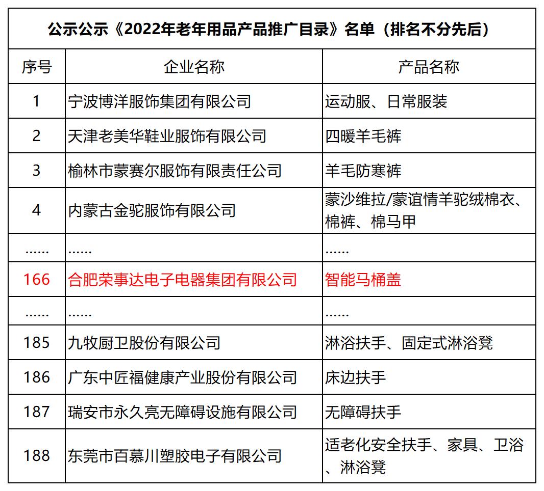 為實(shí)施積極應對人口老齡化國家戰略,加強新時(shí)代老齡工作,進(jìn)一步提升廣大老年人的獲得感、幸福感、安全感,近日,國家工業(yè)和信息化部消費品工業(yè)司公示了《2022年老年用品產(chǎn)品推廣目錄》,榮事達集團旗下產(chǎn)品——榮事達智能馬桶蓋憑借出色的性能以及適老化的功能設計成功上榜,并順利通過(guò)公示。