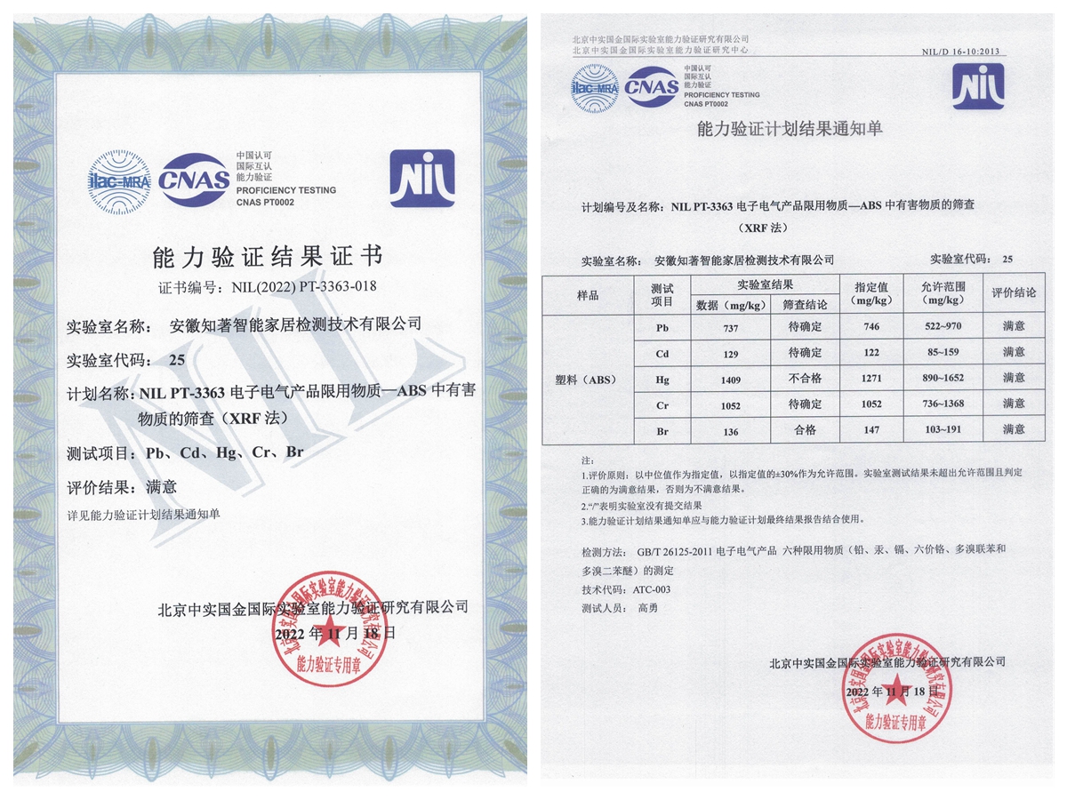 近日,榮事達集團旗下安徽知著(zhù)智能家居檢測技術(shù)有限公司,收到北京中實(shí)國金國際實(shí)驗室能力驗證研究有限公司的《NIL PT-3363 電子電氣產(chǎn)品限用物質(zhì)—ABS中有害物質(zhì)的篩查(XRF法)》能力驗證項目的滿(mǎn)意結果證書(shū),表明了該項目的檢測結果準確可靠,公司在該項目上具備較高的檢測水平。