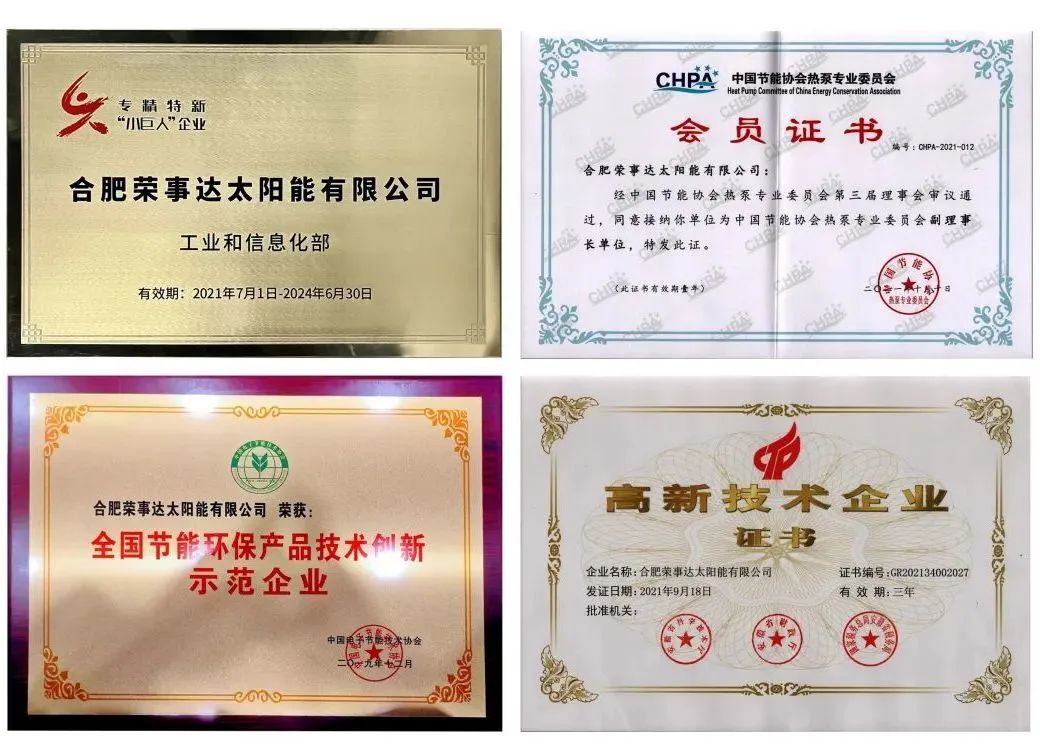 其中,榮事達空氣能、太陽(yáng)能作為榮事達集團新能源產(chǎn)業(yè)版塊的重要組成部分,憑借強勁的產(chǎn)品優(yōu)勢獲得了良好的市場(chǎng)口碑,滿(mǎn)足了消費者對于低碳生活的追求,得到了行業(yè)的認可和贊賞,相繼獲得“國家級專(zhuān)精特新小巨人企業(yè)”“國家級高新技術(shù)企業(yè)”“全國節能環(huán)保產(chǎn)品技術(shù)創(chuàng )新示范企業(yè)”等多項榮譽(yù)。