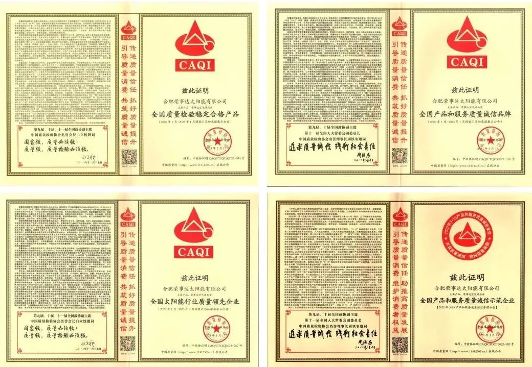 一直以來(lái),榮事達堅持以品質(zhì)求生存,以誠信謀發(fā)展的經(jīng)營(yíng)理念。旗下項目單位——合肥榮事達太陽(yáng)能有限公司更是在品質(zhì)上精益求精、在信用上規范經(jīng)營(yíng),贏(yíng)得了經(jīng)銷(xiāo)商以及終端消費者的信任,先后被評為“全國產(chǎn)品和服務(wù)質(zhì)量誠信示范企業(yè)”“重合同守信用企業(yè)”“全國產(chǎn)品和服務(wù)質(zhì)量誠信品牌”“全國質(zhì)量檢驗穩定合格產(chǎn)品”“全國太陽(yáng)能行業(yè)質(zhì)量領(lǐng)先企業(yè)”等多項榮譽(yù)。