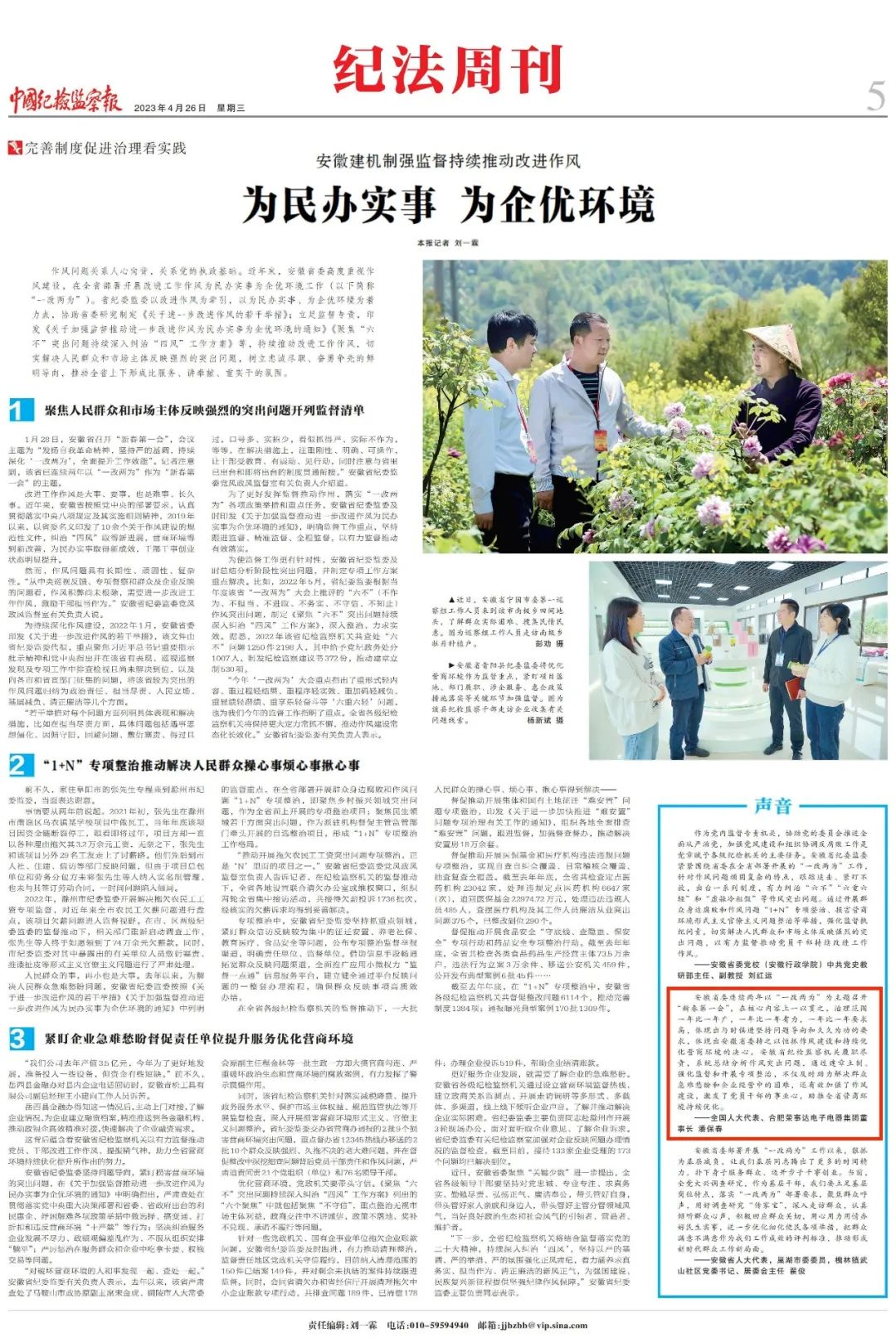 作風(fēng)問(wèn)題關(guān)系人心向背,關(guān)系黨的執政基礎。日前,中央權威媒體——中國紀檢監察報在《紀檢周刊》專(zhuān)題中,報道了安徽建機制強監督持續推動(dòng)改進(jìn)作風(fēng),實(shí)現為民辦實(shí)事、為企優(yōu)環(huán)境的一系列實(shí)踐舉措,全國人大代表、榮事達集團董事長(cháng)潘保春在中國紀檢監察報上發(fā)聲,點(diǎn)評全省紀檢監察系統“一改兩為”實(shí)踐工作。