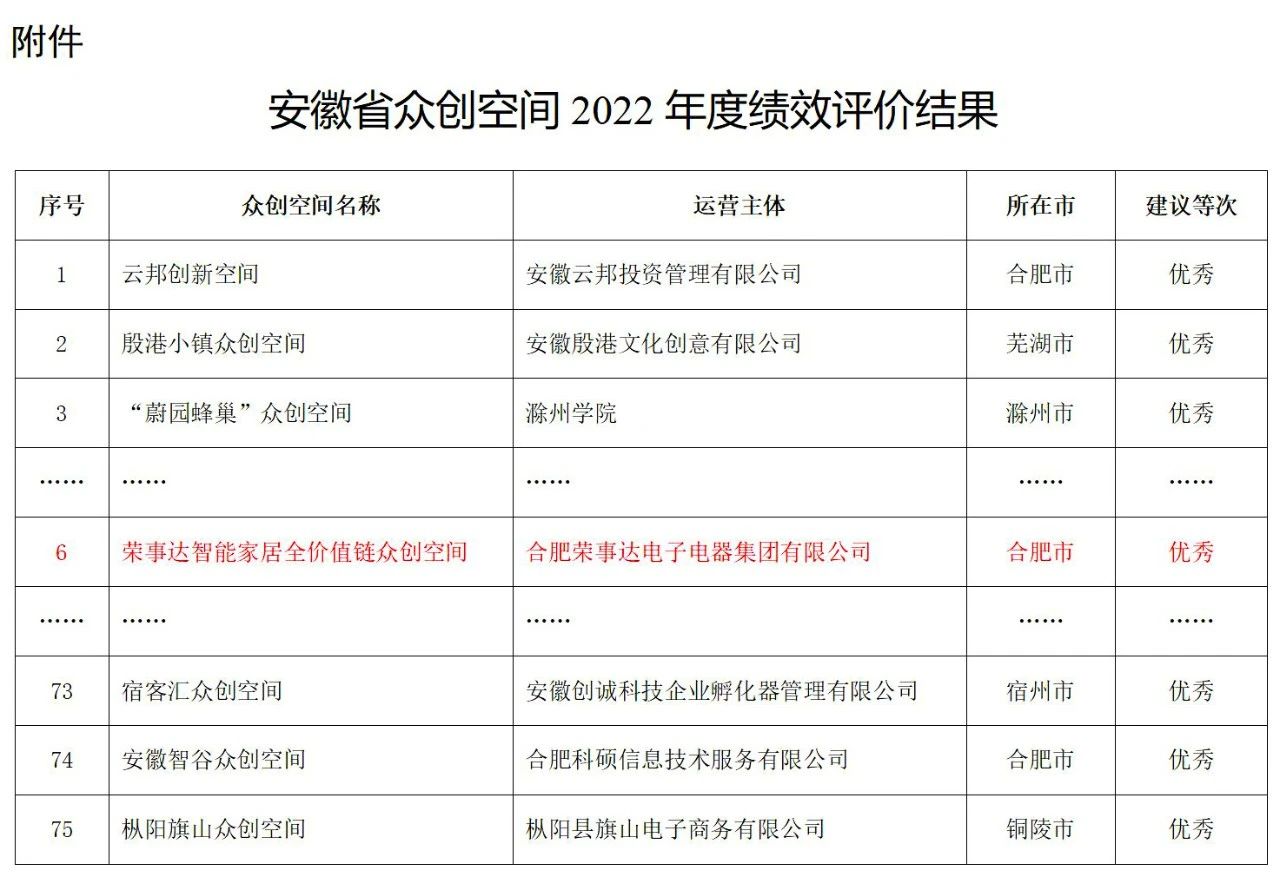 為推動(dòng)“雙創(chuàng )”健康發(fā)展,營(yíng)造良好的創(chuàng )新創(chuàng )業(yè)生態(tài)。日前,安徽省科技廳發(fā)布了“關(guān)于安徽省科技企業(yè)孵化器和眾創(chuàng )空間2022年度績(jì)效評價(jià)結果的公示”,其中,榮事達智能家居全價(jià)值鏈眾創(chuàng )空間,在本次評選中獲評“優(yōu)秀”等級。
