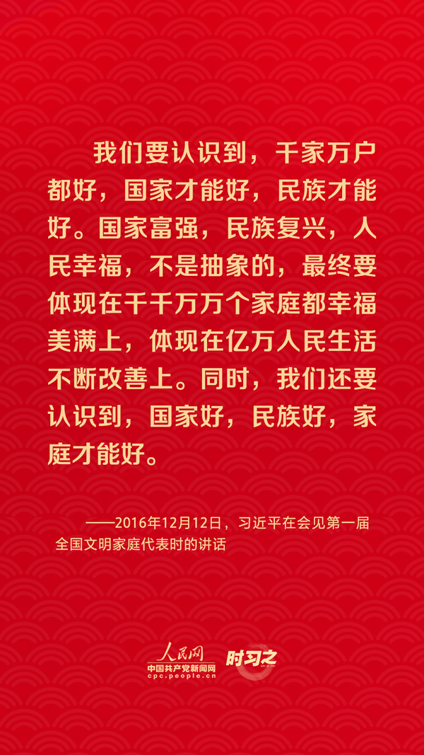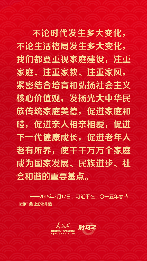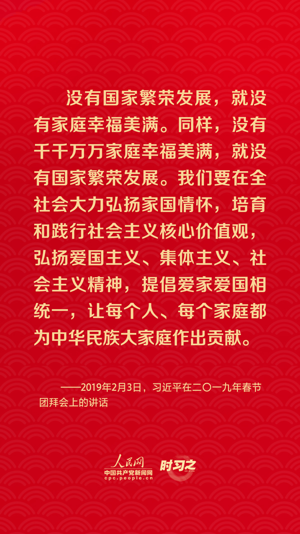 團圓是春節永恒的主題。“沒(méi)有國家繁榮發(fā)展,就沒(méi)有家庭幸福美滿(mǎn)。同樣,沒(méi)有千千萬(wàn)萬(wàn)家庭幸福美滿(mǎn),就沒(méi)有國家繁榮發(fā)展。”習近平總書(shū)記曾在多個(gè)場(chǎng)合深刻闡述家庭與國家之間的關(guān)系,從他的話(huà)語(yǔ)里一起感悟深厚的家國情懷。