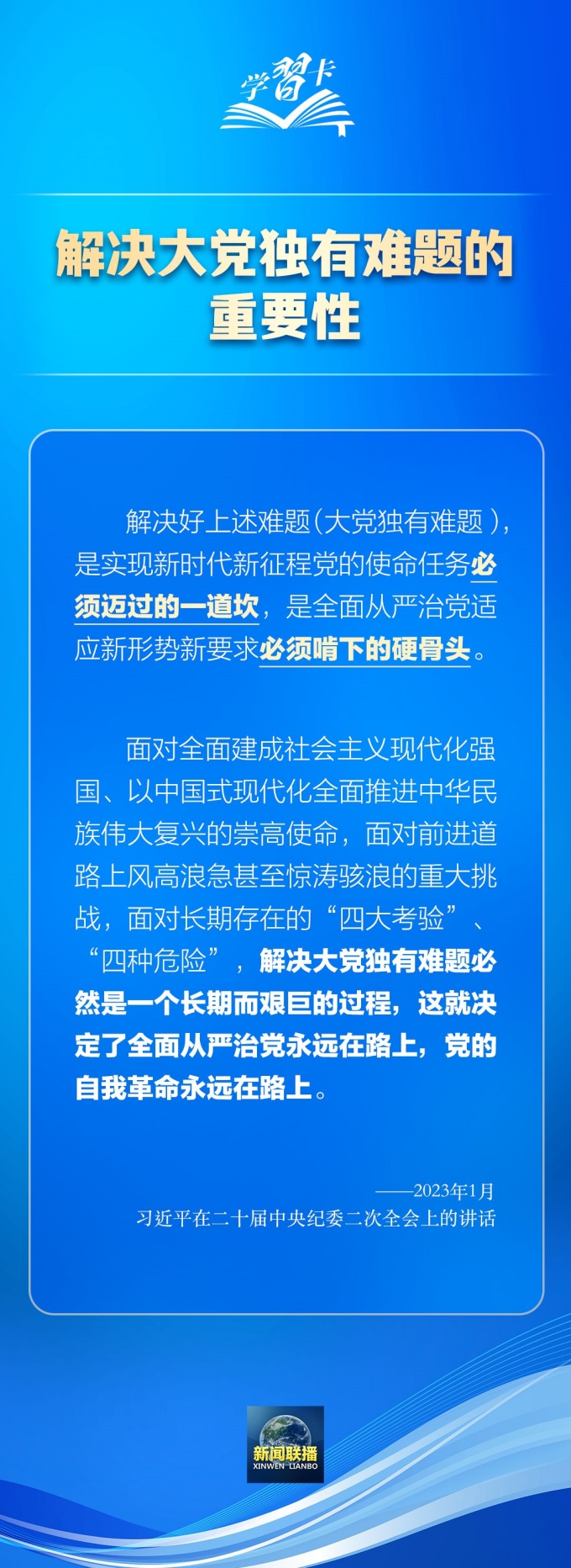 習近平總書(shū)記在不同場(chǎng)合多次強調全面從嚴治黨、黨的自我革命的重要性。解決好大黨獨有難題,是實(shí)現新時(shí)代新征程黨的使命任務(wù)必須邁過(guò)的一道坎,是全面從嚴治黨適應新形勢新要求必須啃下的硬骨頭。