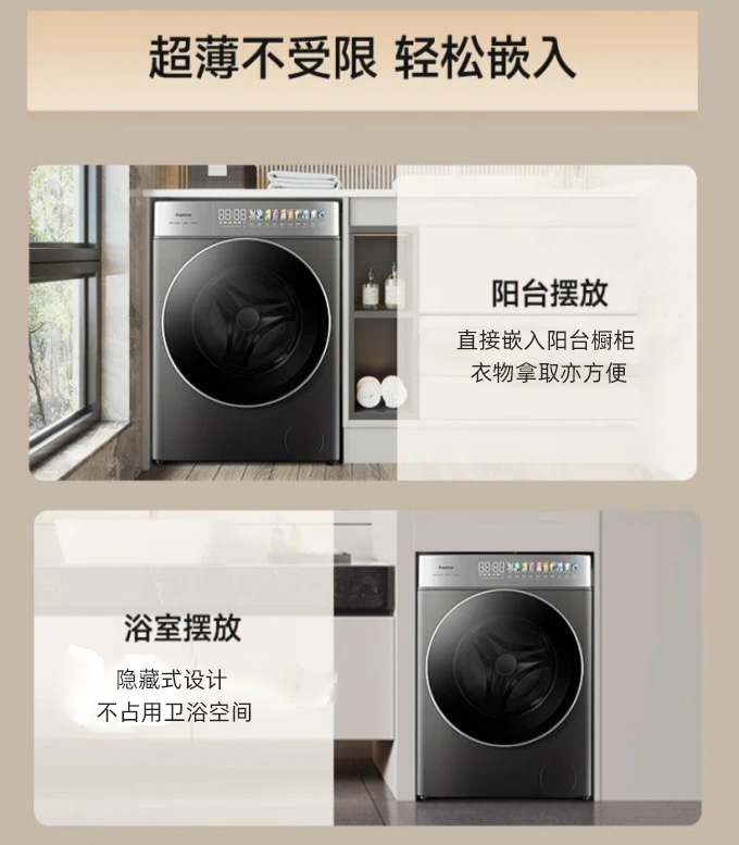在崇尚簡(jiǎn)約設計的當下,榮事達大薄系列滾筒洗衣機(XQG120-18DQ)采用“超薄平嵌”一體式設計方案,成功引領(lǐng)一體化家居美學(xué)新趨勢。在尺寸上,大薄系列滾筒洗衣機擁有纖薄機身,契合不突出,不做“顯眼包”。無(wú)論是常規擺放還是嵌入設計,都讓家庭空間更加精致和諧。但薄機身并不意味著(zhù)小容量,這款產(chǎn)品的常規洗滌容量完全可以滿(mǎn)足普通家庭的洗滌需求。
