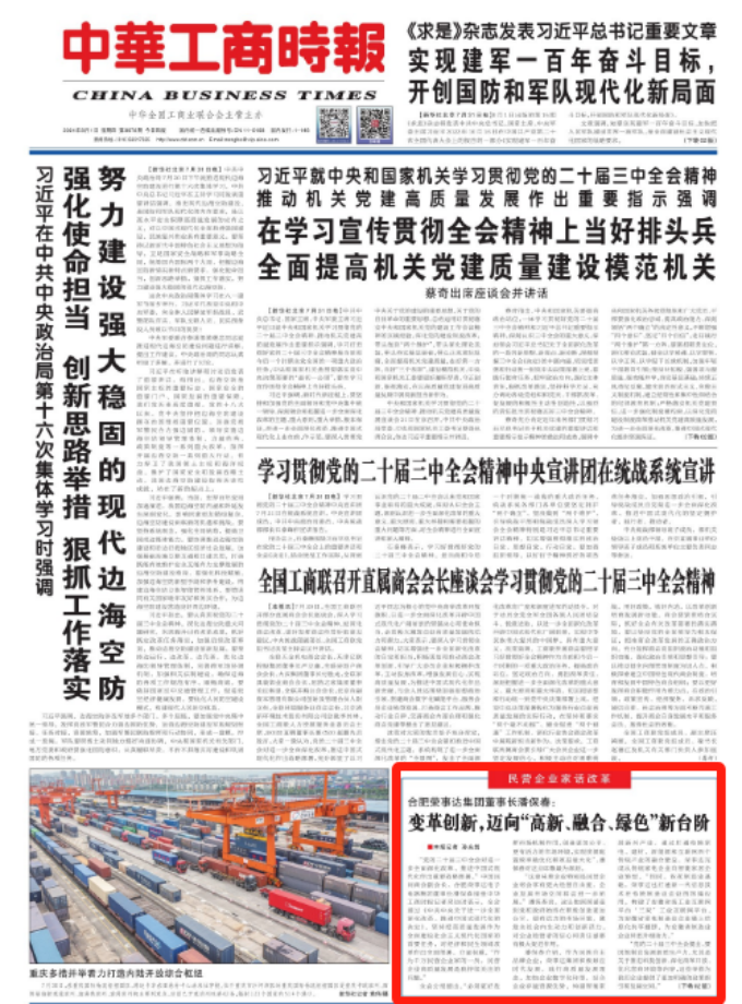 8月1日,全國工商聯(lián)主管權威媒體《中華工商時(shí)報》在“民營(yíng)企業(yè)家話(huà)改革”專(zhuān)欄中刊發(fā)了對榮事達集團董事長(cháng)潘保春的專(zhuān)訪(fǎng)——“變革創(chuàng )新,邁向‘高新、融合、綠色’新臺階”。