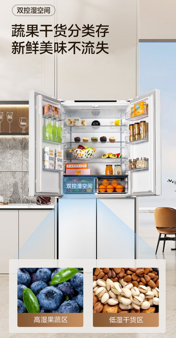 此外,這款冰箱還專(zhuān)門(mén)設置了雙控濕空間,干貨可以采用低濕存儲,鎖住營(yíng)養和新鮮度。蔬果采用高濕存儲,保鮮口感不打折。