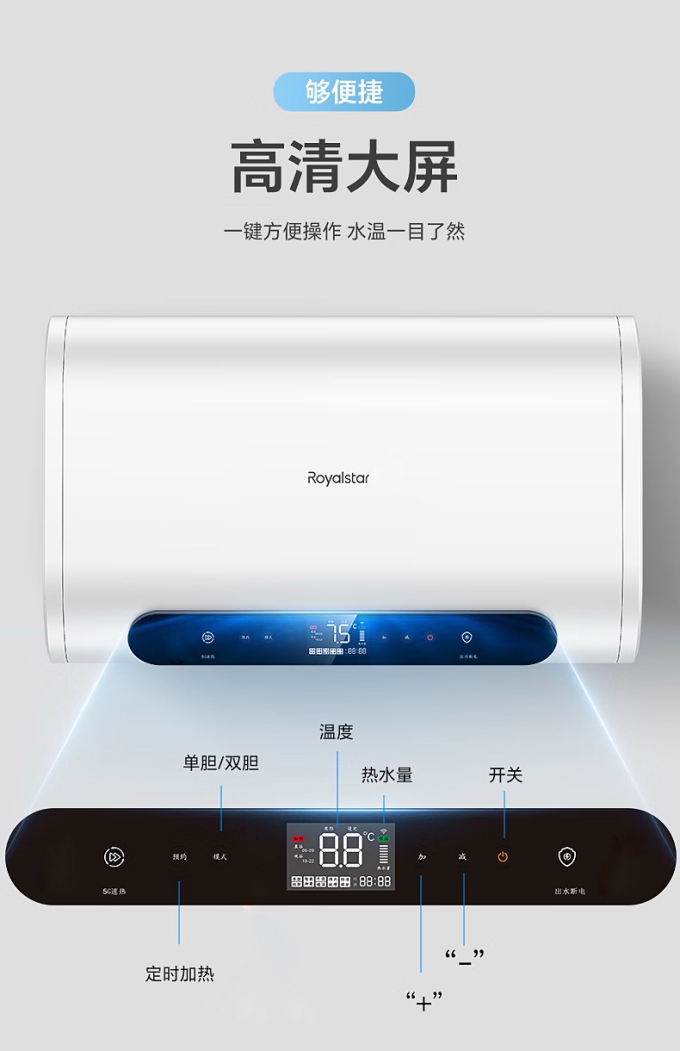 榮事達電熱水器(RSD-T01-50)擁有令人矚目的高清大屏,能將熱水器的各項信息生動(dòng)而精準地展示在用戶(hù)眼前。一鍵操作的設計理念,將復雜的功能簡(jiǎn)化為只需輕輕一按的簡(jiǎn)單動(dòng)作。無(wú)論是忙碌一天后疲憊不堪的上班族,還是對復雜電器操作感到困難的老年人,都無(wú)需再面對繁瑣的按鍵和復雜的說(shuō)明書(shū),真正做到了便捷操作與實(shí)用功能的無(wú)縫融合。