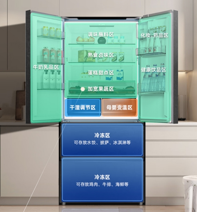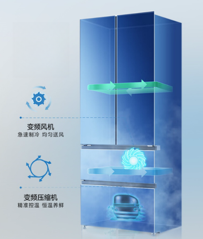 傳統冰箱風(fēng)速檔位少,無(wú)法根據冰箱內部溫度的變化進(jìn)行智能調節,這就容易導致冰箱內部溫度分布不均勻,部分區域的食品可能會(huì )因溫度過(guò)低而結冰,而其他區域的食品則可能溫度不夠低,影響保鮮效果。榮事達零嵌系列法式四門(mén)冰箱(BCD-515WFGPQ)的風(fēng)機和壓縮機均采用變頻技術(shù),可以根據冰箱內部不同區域的溫度狀況自動(dòng)調節轉速,為食物提供了更適宜的儲存環(huán)境,有利于延長(cháng)食品的保鮮期。