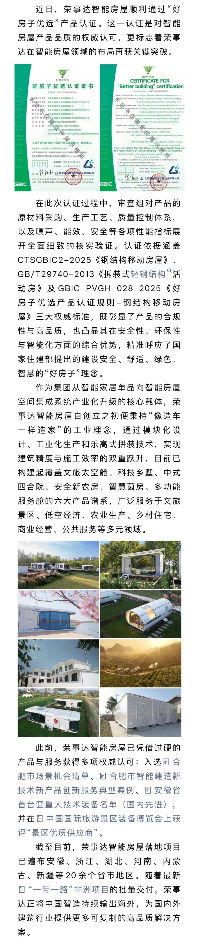 榮事達智能房屋斬獲“好房子優(yōu)選”認證