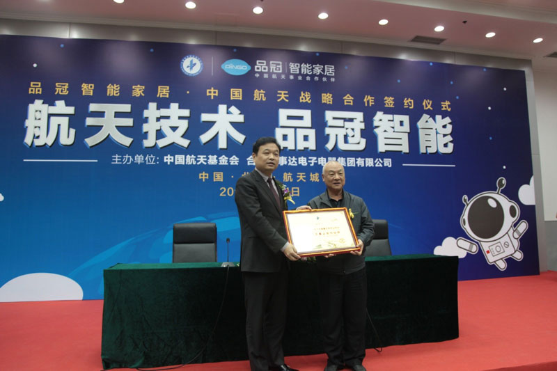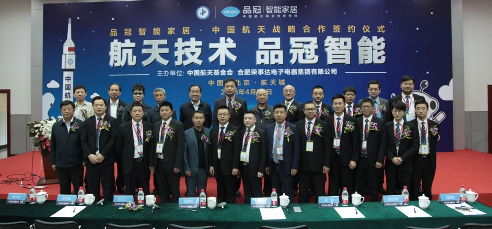 2016年4月24日是國務(wù)院批準的中國首屆“航天日”,在這個(gè)特殊的日子里,合肥榮事達電子電器集團有限公司與中國航天基金會(huì )在北京航天城隆重舉辦了“品冠智能家居•中國航天戰略合作簽約儀式”,品冠品牌成為智能家居產(chǎn)業(yè)獨家“中國航天事業(yè)合作伙伴”。中國航天基金會(huì )理事長(cháng)、總裝備部原副部長(cháng)張建啟中將,基金會(huì )秘書(shū)長(cháng)、酒泉發(fā)射中心原副司令員張玉江少將,合肥榮事達電子電器集團董事長(cháng)、安徽品冠投資集團董事局主席潘保春,榮事達電子電器集團常務(wù)副總裁馬睿等高層領(lǐng)導出席簽約儀式。安徽品冠投資集團董事局潘保春主席與中國航天基金會(huì )理事長(cháng)張建啟中將分別代表雙方致辭。致辭結束后,常務(wù)副總裁馬睿與張玉江少將完成了簽約,張建啟中將為潘保春主席頒發(fā)了“中國航天事業(yè)合作伙伴”的授權牌。