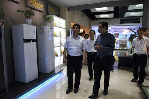 在榮事達空氣能產(chǎn)品展廳,潘保春董事長(cháng)向調研組一行詳細介紹,空氣能熱水機的工作原理。