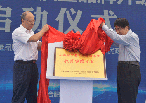 啟動(dòng)儀式上,省質(zhì)監局局長(cháng)朱琳和省工商局副局長(cháng)朱斌一起為合肥榮事達電子電器集團有限公司“安徽省質(zhì)量品牌升級工程教育實(shí)踐基地”揭牌,合肥榮事達電子電器集團有限公司董事長(cháng)潘保春代表合肥企業(yè)宣讀質(zhì)量品牌升級承諾書(shū),向社會(huì )鄭重承諾嚴守產(chǎn)品質(zhì)量與責任。