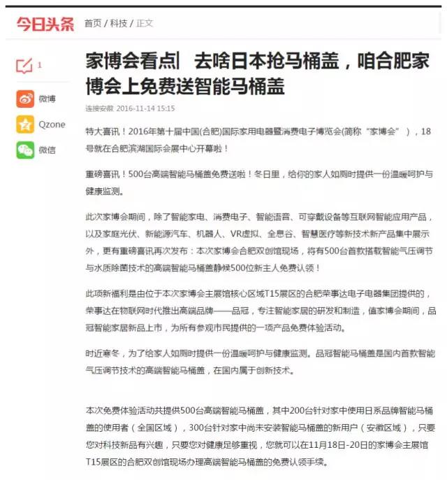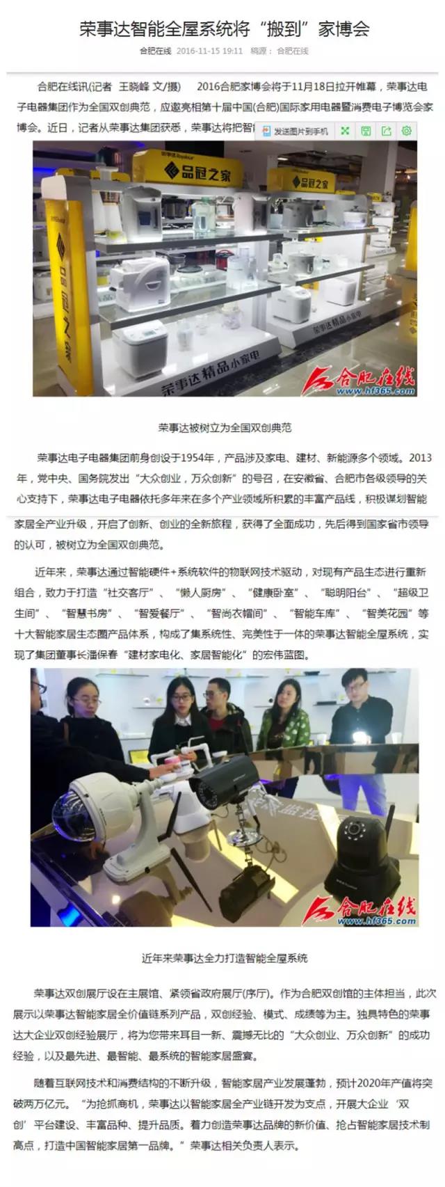 11月15日,《新華網(wǎng)》《今日頭條》《合肥在線(xiàn)》分別以《榮事達:大企業(yè)雙創(chuàng ),亮相家博會(huì )》《去啥日本搶馬桶蓋,咱合肥家博會(huì )上免費送智能馬桶蓋》《榮事達智能全屋系統將“搬到”家博會(huì )》為題報道了榮事達即將亮相家博會(huì )的消息。