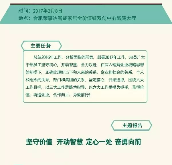 2月8日,榮事達電子電器集團在全國雙創(chuàng )示范基地——榮事達智能家居全價(jià)值鏈雙創(chuàng )中心路演大廳召開(kāi)集團干部工作會(huì )議,總結2016年工作,分析面臨的形勢,部署2017年工作。集團董事長(cháng)潘保春作題為《堅守價(jià)值 開(kāi)動(dòng)智慧 定心一處 奮勇向前》的主題報告。