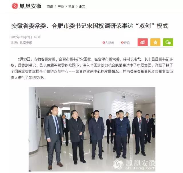 2月23日,安徽省委常委、合肥市委書(shū)記宋國權,在合肥市委常委、秘書(shū)長(cháng)韋弋,長(cháng)豐縣縣委書(shū)記許華,縣委副書(shū)記、縣長(cháng)黃韡等領(lǐng)導的陪同下,深入全國雙創(chuàng )典范合肥榮事達電子電器集團,詳細了解了全國首家智能家居全價(jià)值鏈雙創(chuàng )中心——榮事達雙創(chuàng )中心的發(fā)展情況,并與潘保春董事長(cháng)及各事業(yè)部負責人進(jìn)行了親切交流。