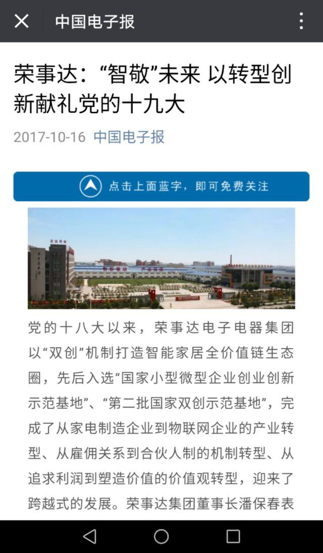 恰逢中國共產(chǎn)黨第十九次全國代表大會(huì )召開(kāi)之際,工業(yè)和信息化部主管的《中國電子報》專(zhuān)題報道了榮事達雙創(chuàng )事業(yè)。對此,集團董事長(cháng)潘保春表示,榮事達將繼續加大自主創(chuàng )新力度,以更好的成績(jì)向國人獻禮。