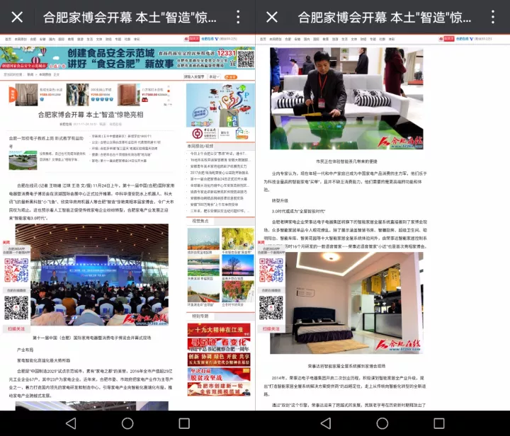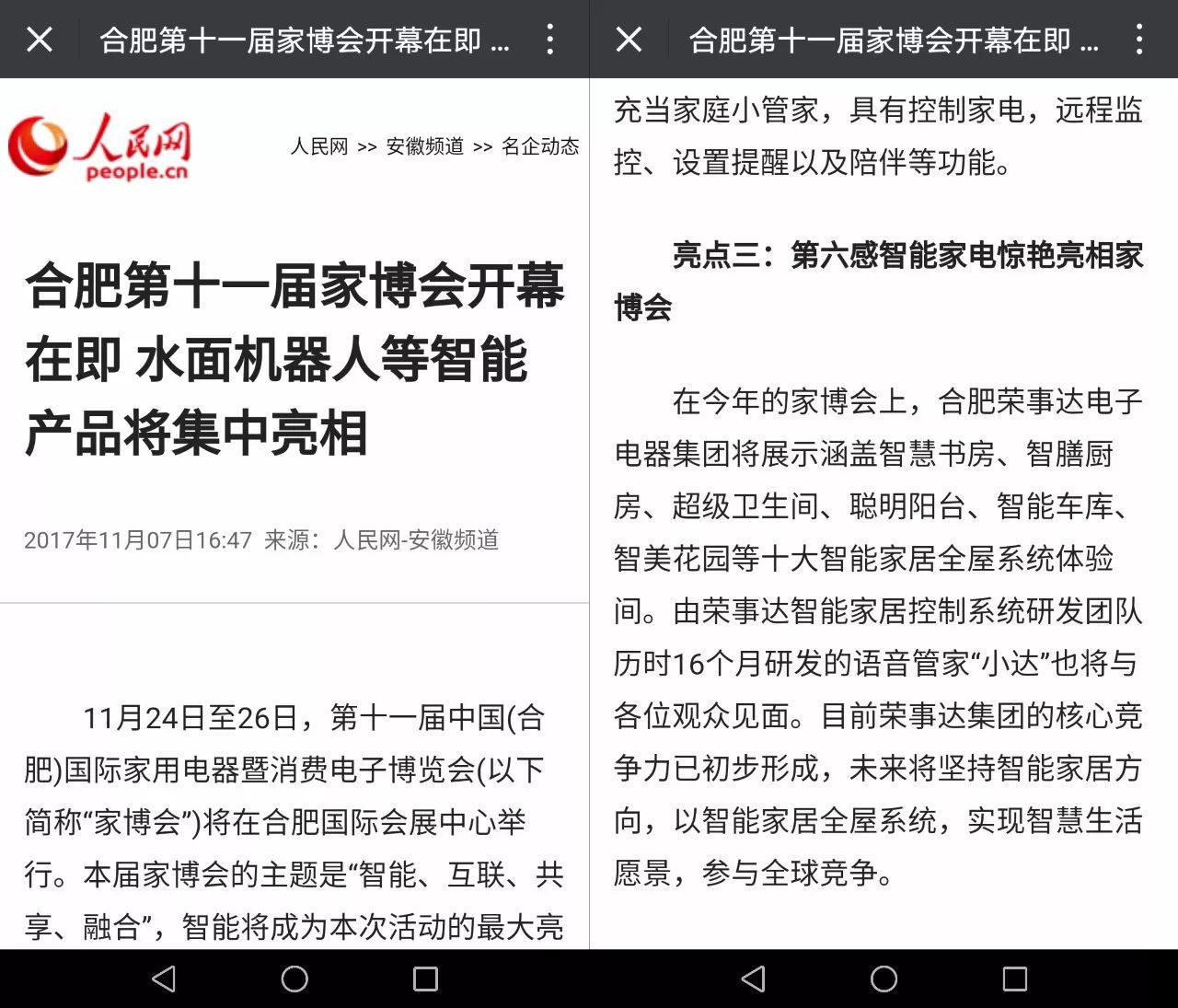 隨即,11月25日的《合肥新聞聯(lián)播》報道指出:作為全國雙創(chuàng )典范,本屆(合肥家博會(huì ))展會(huì )上,合肥榮事達電子電器集團不僅將智能家居全屋系統帶到現場(chǎng),還帶來(lái)很多新型智能家居單品,讓市民現場(chǎng)體驗高端化、智能化、便捷化的科技居家生活。