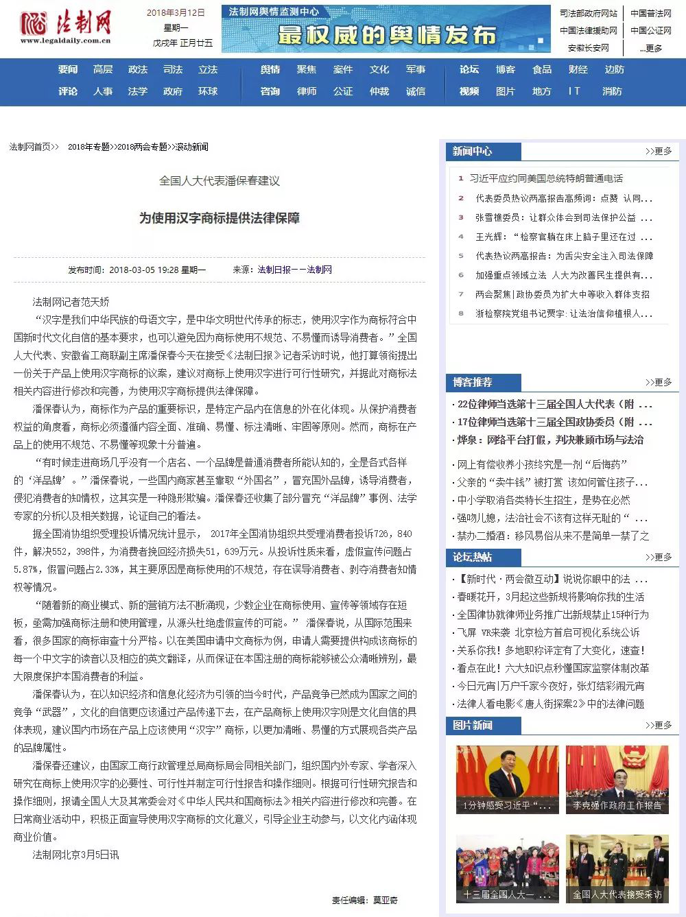 ◆ 3月5日,司法部主管權威媒體《法制日報》旗下法制網(wǎng)刊發(fā)對潘保春董事長(cháng)專(zhuān)訪(fǎng)——《全國人大代表潘保春建議:為使用漢字商標提供法律保障》。